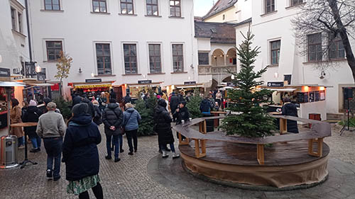In 2023, the ice-skating ring was moved from under the horse-riding statue of Jost of Moravia to the park and swapped places with the stands which means the market moved closer to the other ones (it is now about 350 m from the main square). Besides the beverages, you can find here mostly charity stands and a carousel for small children. There is also a haystack for the children to play on and a stage.
