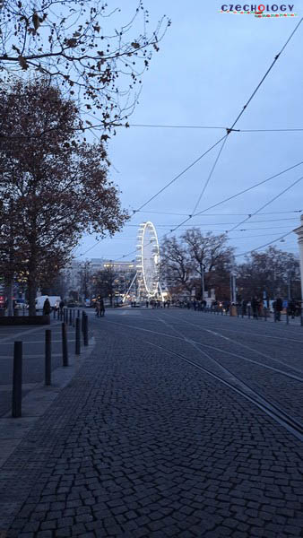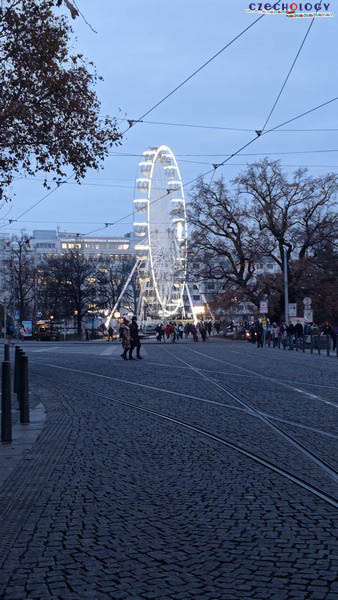 When you look up Rašínova street, you will see the Ferris wheel (in Czech called ruské kolo – Russian wheel) at the market at Moravské náměstí.