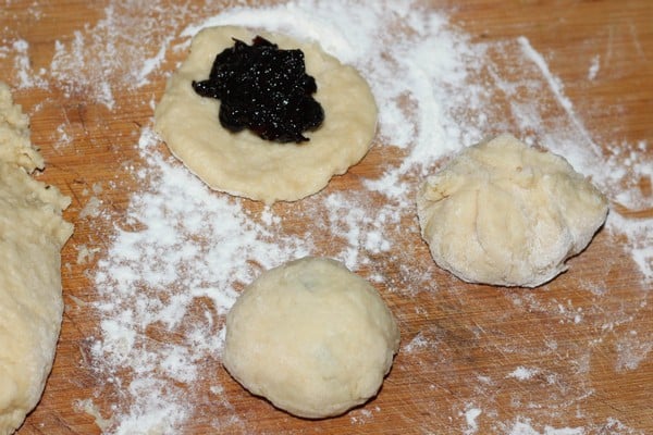 Take a handful of the dough, form a ball, then flatten it and stretch a little. Place some filling in the center, close the dough and form a ball again.