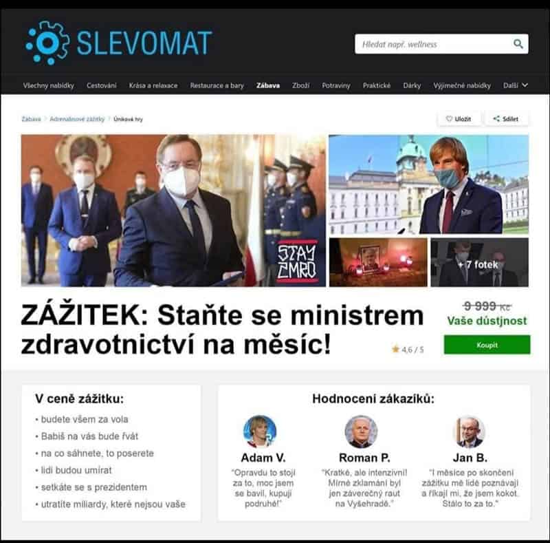 Currently the most popular object of jokes is the absurdity of the covid-restrictions introduced by the Czech government (discos can open but it’s forbidden to dance there) as well as the fact that Ministers of Health keep changing almost every month (5 ministers in 2021 by May).