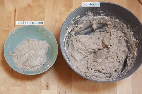 Now it’s time to combine the contents of both bowls. If you want to set some sourdough aside for later baking, take 1 or 2 tbsp of the 2nd sourdough, all the rest will go into your sourdough rye bread.