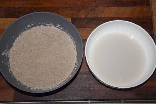 At the same time that you make the 2nd sourdough, make the 1st dough from the 1st sourdough, after you’ve taken away that 1 tbsp. So mix the rest of the sourdough with 200 g/7 oz of water and 300 g/10.6 oz of rye flour. Cover this bowl as well and let it ferment for 12 hours. Therefore, you’ll have the 2nd sourdough and 1st dough fermenting at the same time.