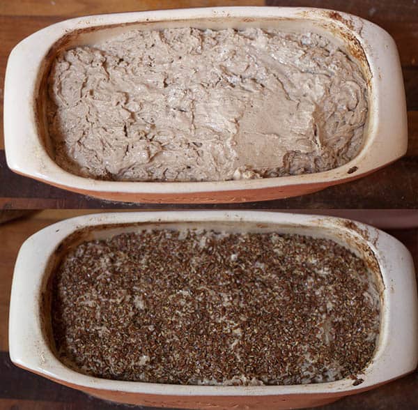 Smear the baking pan with oil and move all the dough to the pan. Don’t stuff the dough, just let it fall into the pan and even the surface a little. Sprinkle the flaxseed or sunflower seed on top and let the dough rise a little. It won’t take long now, about half an hour.