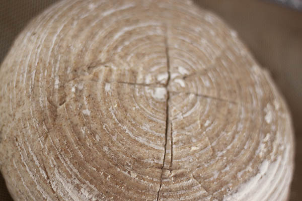 Preheat the oven to 250°C/482°F, flip the bread from the basket onto a baking tray. With a very sharp knife, make 2 to 3 cuts on the top of the bread. Cross is traditional but you can make other shape. These cuts will prevent the bread from cracking too much on the side. My bread usually cracks anyway but just a little and the loaf has a nice shape.