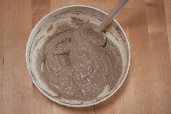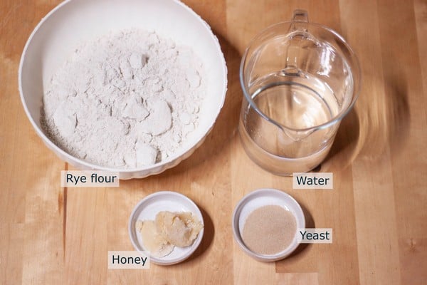 Warm up the water and stir in the yeast. Then stir in the honey. Place the rye flower in a bowl, add the yeast mixture and combine everything well. A wooden spoon would be enough at this point. The bread dough starter will be quite liquid.