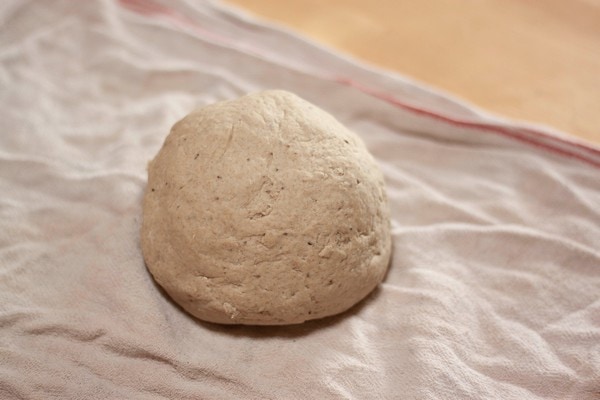 Put the dough back in the bowl, sprinkle a little flour on and cover the bowl with a towel. Let the dough raise in a warm place. If it’s a warm day, it shouldn’t take long, you can also place the bowl outside in sunlight (still covered though) or in an oven heated to approximately 30°C/86°F. When the dough has doubled in volume, take it out again and repeat the kneading process folding the dough several more times. Let it rise again.