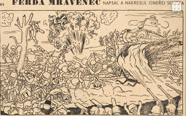 The ant called Ferda first appeared in the newspaper Lidové noviny in 1933 in The Adventures of Ferda the Ant. The first issues were for adults rather than children, Ferda was a seasoned ant who practiced shooting and fought the enemy in response to the international events (events predating the WWII). Some of the first comic strips pictured even torn limbs or a gas attack. In one episode, the ant even gets married and has a son.