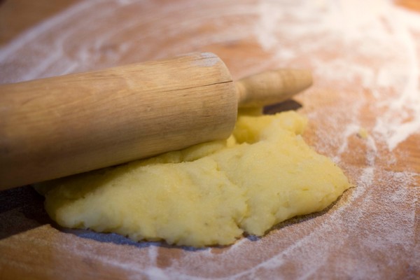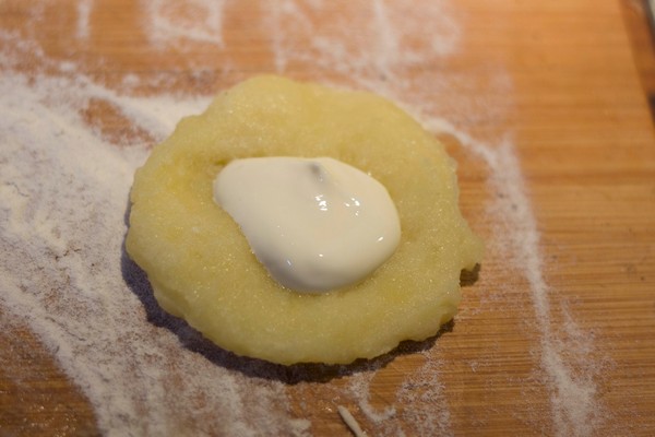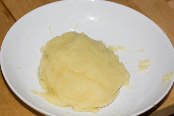 Peel the potatoes as soon as you can hold them in your hand. If you have a fine grinder, pass the potatoes through it twice, if you don’t grate them finely and knead with your hand.