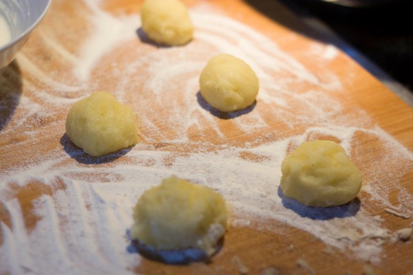 Boil the potatoes in peel for one hour, this should be enough to cook them. Let them cool down just a little bit and meanwhile, prepare the filling because once you have the dough, it’s better to work fast. Mix all the ingredients for the filling well.