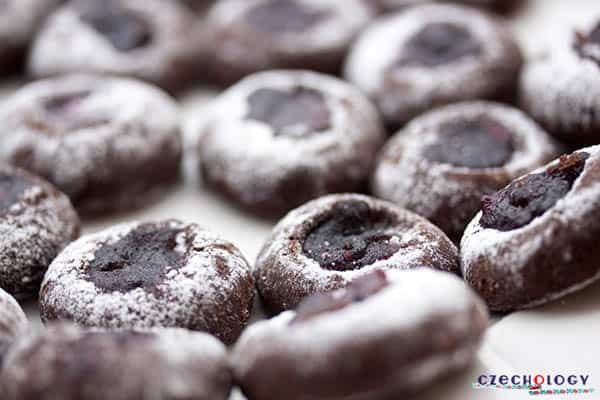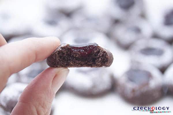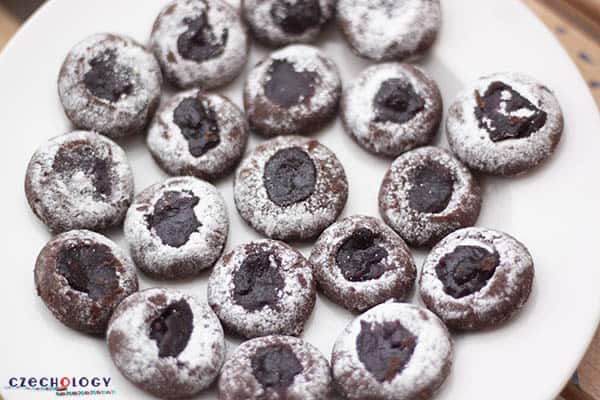 And deservedly so. They have the perfect size, they are just one-bite-cookies, hence the name koláčky (small koláče). Their taste is very intriguing – they have very tender texture with the jam adding just a bit of spiciness. I recommend using jam from more acid fruit such as red currant. Just like with linecké, sweet cookies go best with a piquant jam.