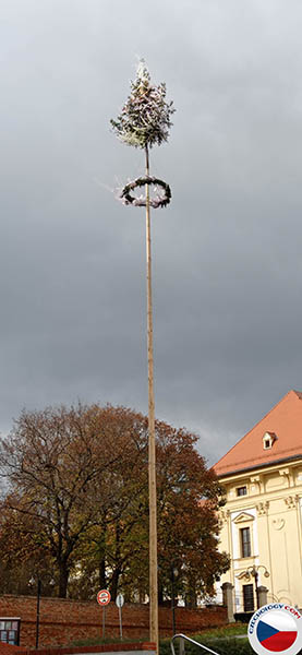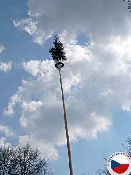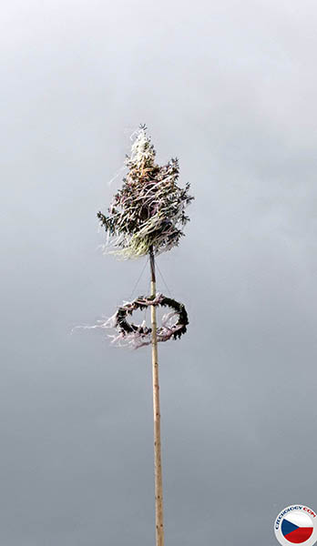Máje (Czech name for the Maypole) is a pole made from a conifer tree, less commonly also a birch tree. The tree has to be very tall and straight. The bark is peeled off, all the branches are cut, except for the very top of the tree. A green wreath is hung just below the top and the top as well the wreath are decorated with ribbons. The decorated tree is a symbol of spring and love. Sometimes smaller Maypoles are placed all over the village/town and earlier boys used to build them also in front of the houses of their girls.