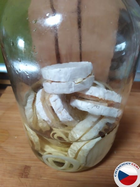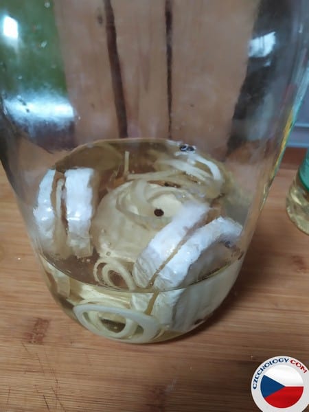 The recommended resting time is between 2 and 4 weeks. After that the cheese will start falling apart (although it will still taste well). The ideal time for the nakládaný hermelín to rest depends on the environment, if you keep it in a place that’s rather warm, don’t exceed the two weeks. Serve ideally with a slice of bread.