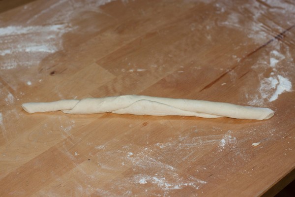 Place dough on a table sprinkled with flour and cut into 12 equal pieces. Form a small loaf from each piece, then roll it out flat into a square. Cut the square diagonally into two triangles.