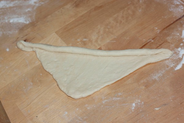 Place dough on a table sprinkled with flour and cut into 12 equal pieces. Form a small loaf from each piece, then roll it out flat into a square. Cut the square diagonally into two triangles.