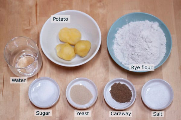 Peel the potatoes and grate them finely. In a large bowl, combine the potato, rye flour, dough starter, salt, water and caraway seeds. Knead until everything’s well combined. It won’t take long, the potato bread dough is much easier to knead than the Wheat Rye Bread.
