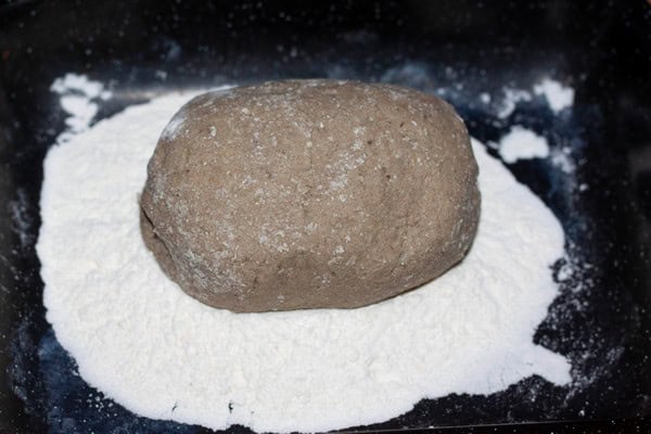 Prepare a baking tray, put a 1 – 2 cm/0.4 – 0.8 in layer of plain flour on it, place the dough on the flour layer, cover it and let the dough rise. Rye flour needs a bit more time than wheat flour to rise, so be patient. If you want to help the process, leave the bowl in a slightly heated oven.