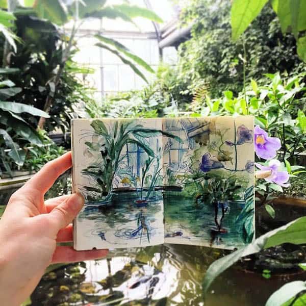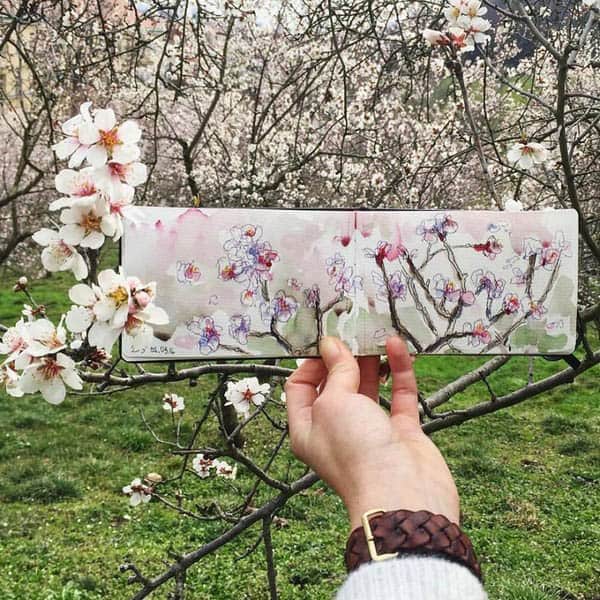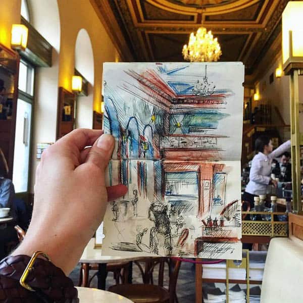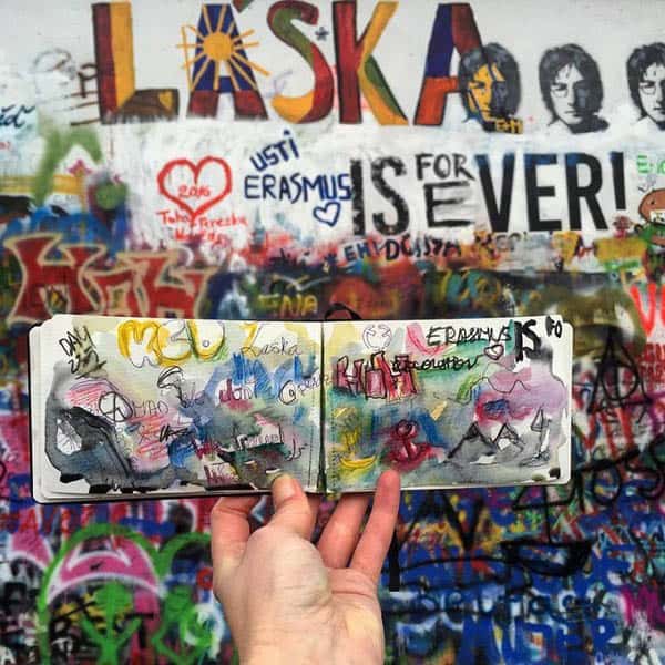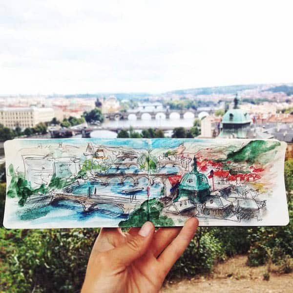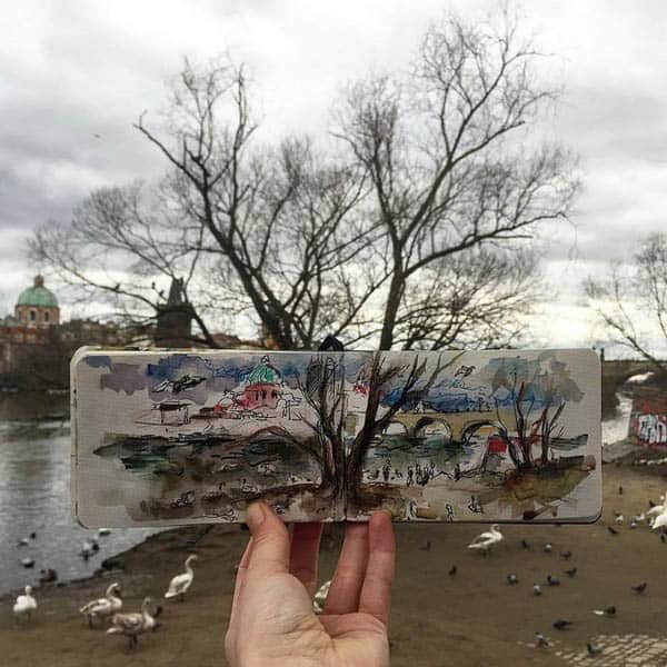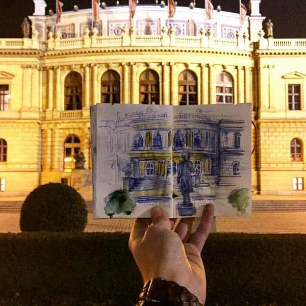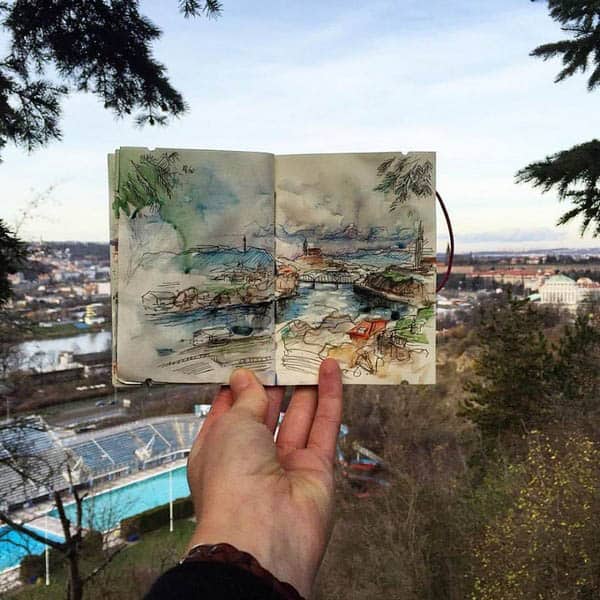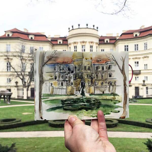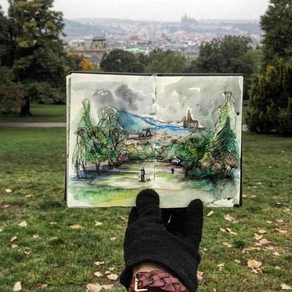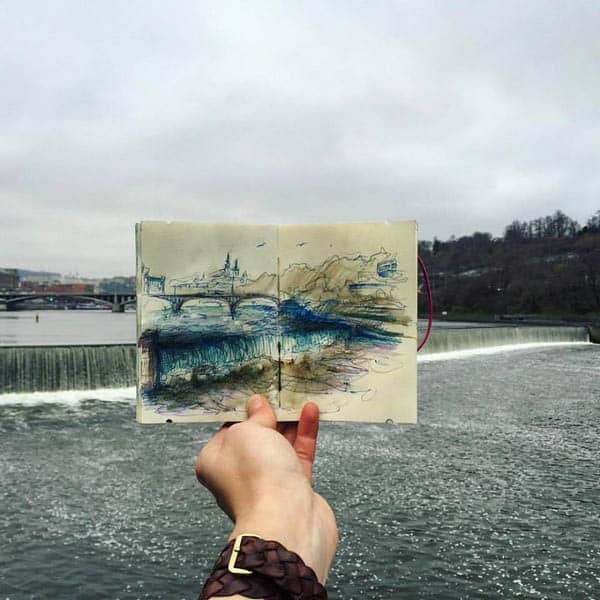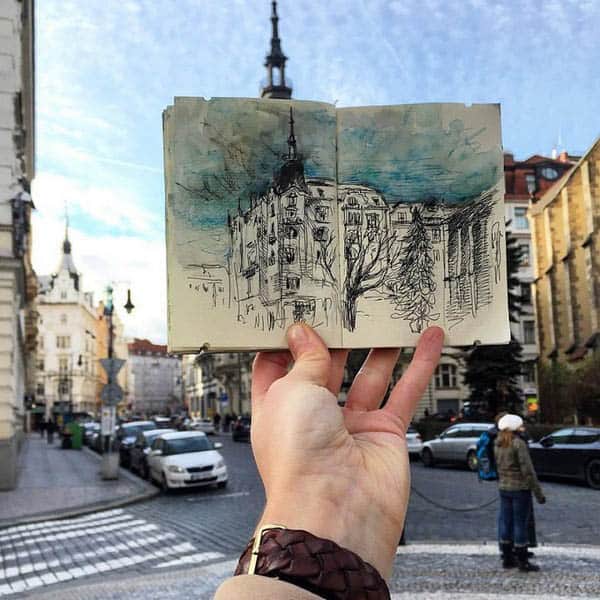 It was July 2015 when Ieva Ozola started a project in which she sketched one place in Prague with ink pen and water colors. The project went on a whole year and she never skipped a day. She photographed the sketches positioning them on the background with whatever was her model that day. The resulting photos were so captivating that she deservedly got the attention of the local media.