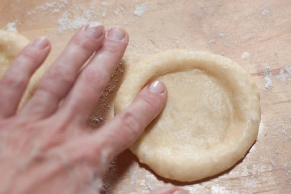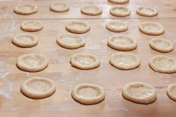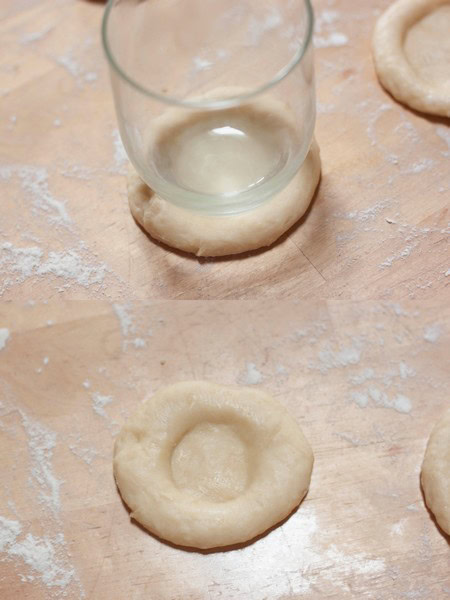 Press a glass into each piece to create a space to fill with the red currant in the koláče. Or you can use your koláče press (důlkovač in Czech).