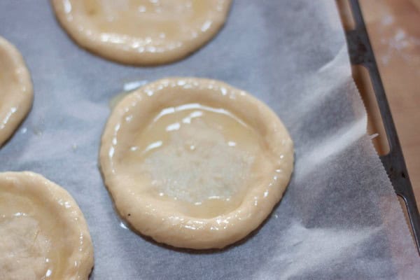 When the dough rises again a little, press the center of each koláč again. Melt the butter and glaze the edges.