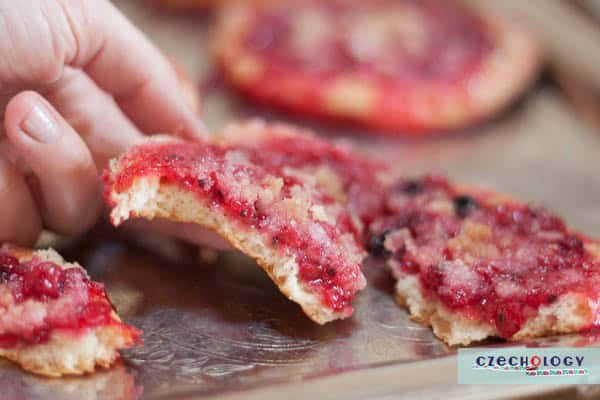 The combination of flavors is unbeatable. The koláče pastry is not too sweet. Red currant has a sour taste which is complemented by the sweet streusel on top of each koláč. Moreover, I make the pastry quite thin with very narrow edges so there’s no dry bites.
