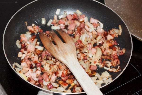 While the dough rises, dice the meat and slice the onion (larger pieces are ok). Fry the meat first, especially if you’re using bacon, it will release grease, then add onion. If needed, add a little oil.