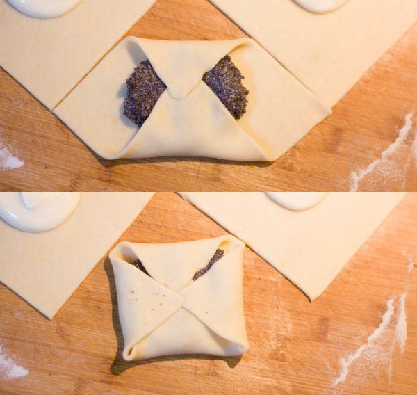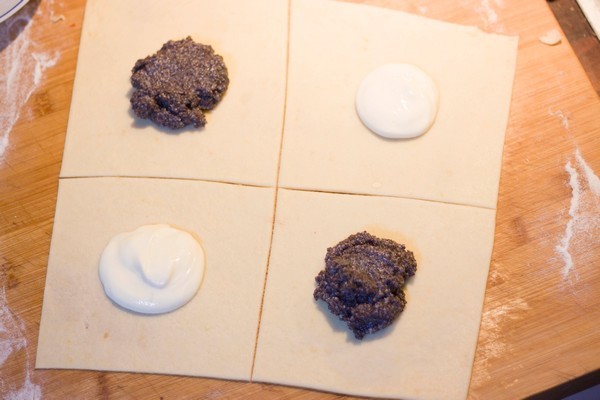 Put a tablespoon of filling in the center of each square.