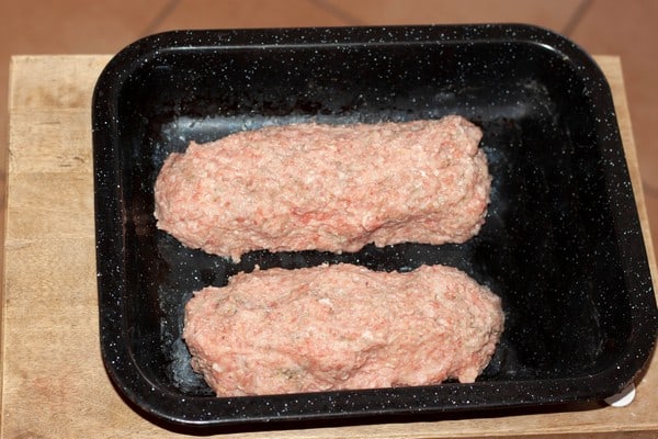Put the meat in a large bowl, add the bread crumbs, egg, marjoram, milk, salt and garlic. Mix it a little with a wooden spoon, then work with your hands, don’t use the kitchen robot for this. You need to work fast, the mixture should stay cold and the longer you touch it, the warmer if will get. You need to use your hands because it needs to be mixed very well and you need to press it with your hands, we don’t really want air in this mixture.