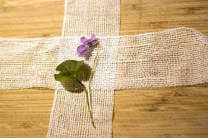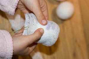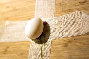 Take two stripes of bandage and lay them down in a cross. They need to be long enough to cover the egg and so you can bind their ends with a thread.