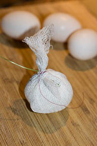 Place the wrapped eggs in boiling water and boil for half an hour or more. The more onion skin and the longer the boiling time, the fuller the resulting color. Leave the eggs in the water until the water cools down, then take the eggs out, unwrap and let dry. Put a few drops of oil onto the napkin and polish the eggs. You can use the eggs as a centerpiece for your table or give them away on Easter Monday during the traditional Czech mrskut.