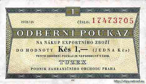 “Tuzex” stands for tuzemský export (national export) and it was a chain of shops established in 1957 where you could buy foreign goods for valuty “foreign cash” or bony/tuzexové poukázky (Tuzex vouchers). Before Tuzex, there were shops called Darex (dárkový export – gift export) and you could find this kind of specialized shops in other communist countries as well. The aim of the existence of these shops was to get the foreign currency from the population. A person who earned their living getting and selling foreign currency was called vekslák (from the German word der Wechsel – exchange). This kind of business was illegal but worth it for some as these people could earn up to 10 times the average salary.