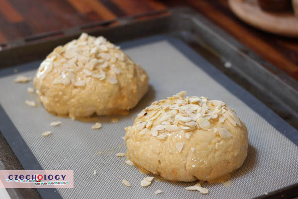Form a loaf or two smaller ones, place it on a baking tray, glaze with whisked egg and sprinkle with almond slices.