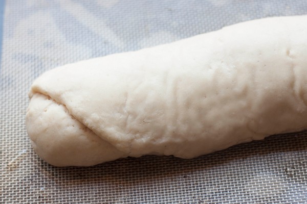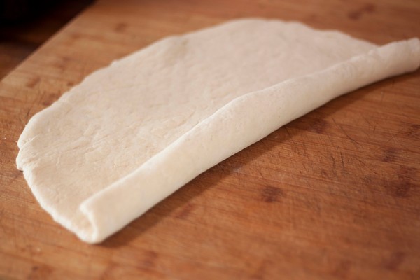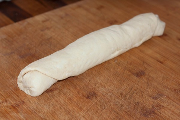 Roll out the dough in a rectangle not less than 1 cm thick. Roll it from one long side to the other. Close the ends. Place veka on a baking tray, cover with a towel and let it rest for 20 minutes.
