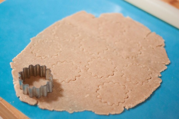 Roll the dough out thin, cut out the shapes (round or round with wavy edge) and transfer them to the baking tray.