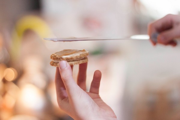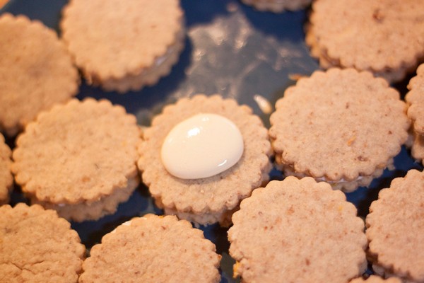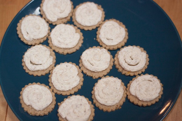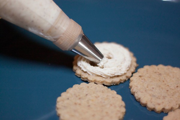 Fill the decorating pipe and pipe the cream on half of all your crackers.