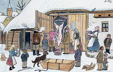 Whole families would come together, sometimes even the whole neighborhood. The preparations extended over several days and right after the pig was slaughtered men and women prepared the traditional dishes from parts of the pig which weren’t meat. Everyone participating in the pig slaughter could keep their part of the final products and meat and the members of the family who organized the event usually brought some also to their relatives and neighbors.